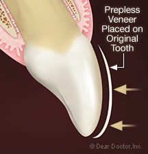Just as with porcelain veneers, “no-prep” or minimal preparation veneers— so called because they typically don’t require the dentist to remove as much tooth material—are bonded to the front surface of your teeth. Often, the placement of no-prep veneers can be done more quickly and with less discomfort than traditional veneers.